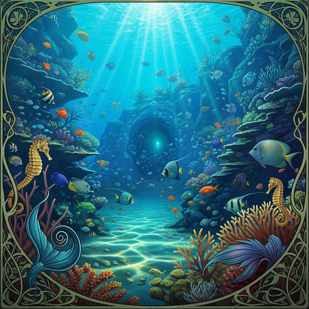 A vibrant coral reef teeming with life. Iridescent fish and seahorses swim amongst the coral, illuminated by sunlight filtering through turquoise water, as a matte painting with art nouveau flourishes.