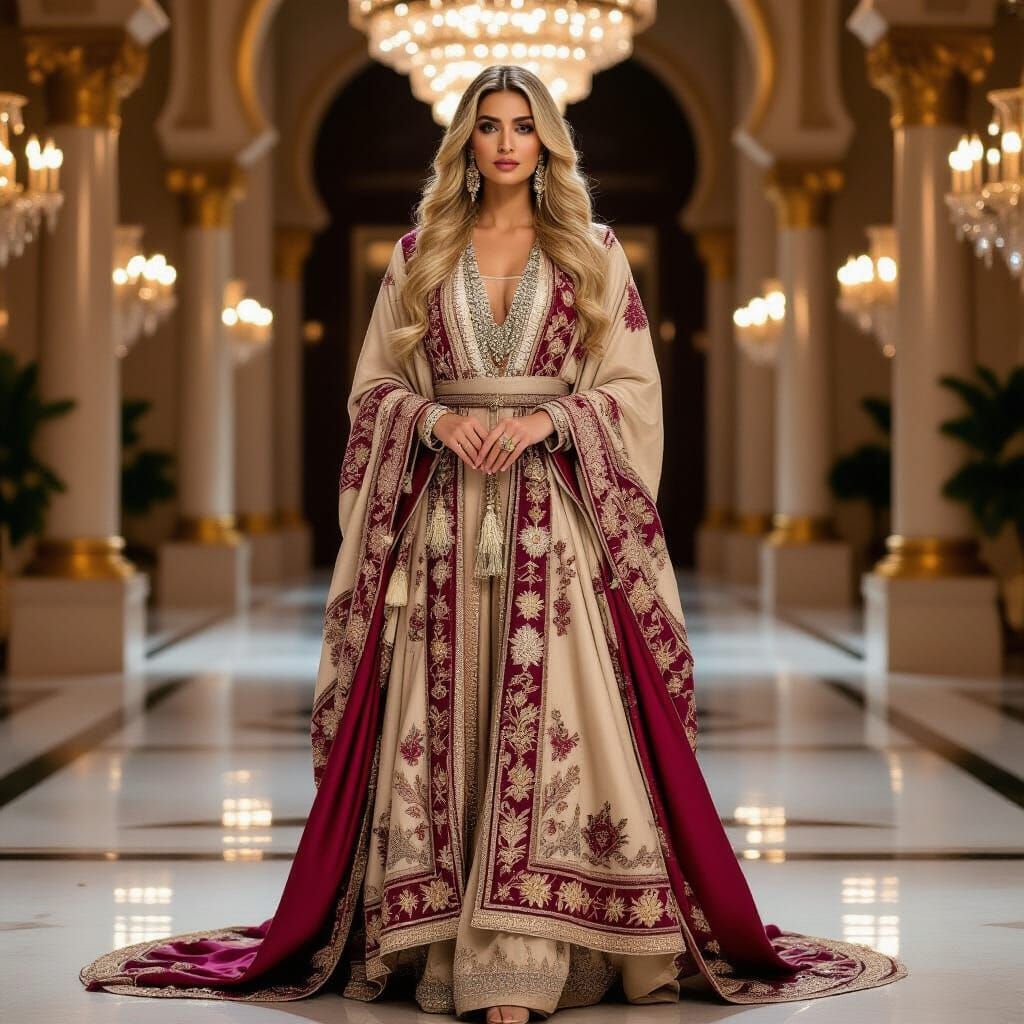 This image shows a blonde woman in a luxurious abaya. The opulent colors, embroidery, and draped fabric create a regal effect, enhanced by dramatic lighting in a cinematic style.