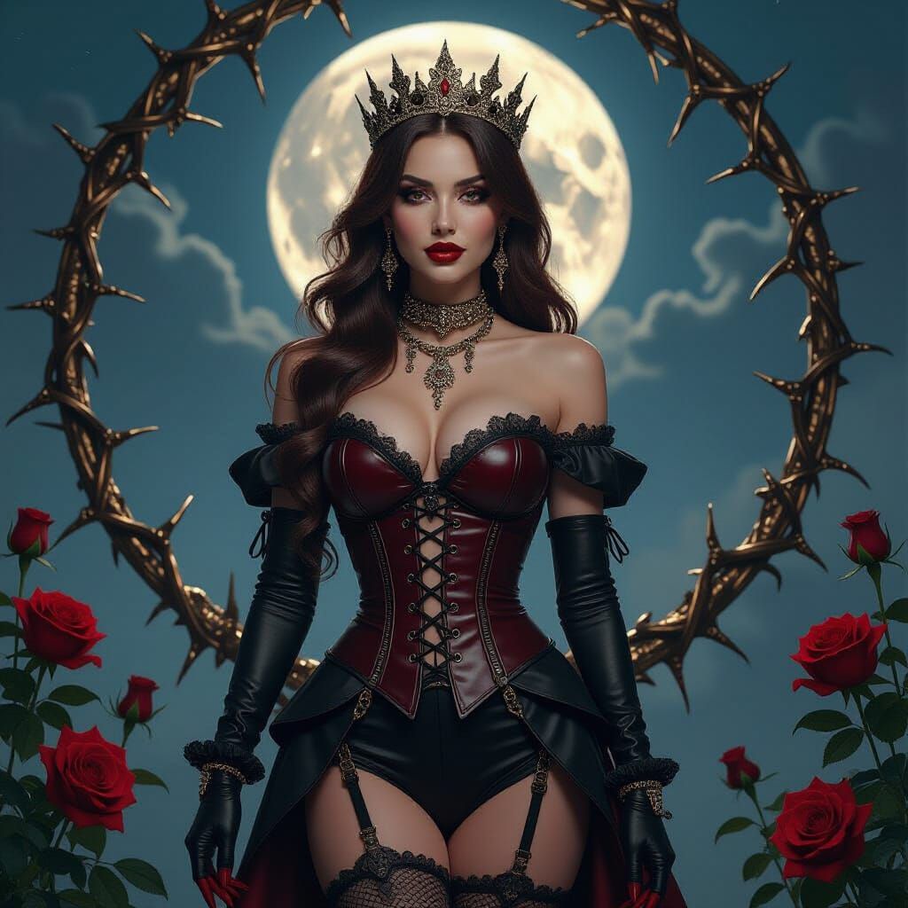 A captivating image of a gothic goddess-mamba hybrid standing in a field of golden thorns under a dramatic moonlit sky. The portrait blends dark futurism with elegant artistry and photorealistic textures.