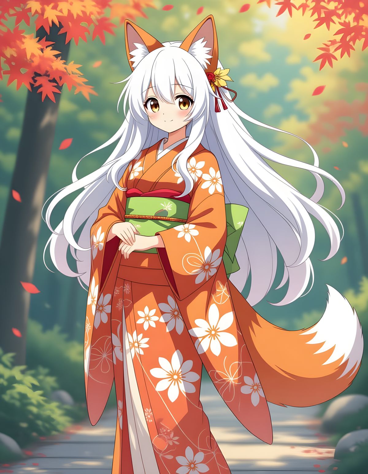 This image features an anime-style fox girl with white hair and multiple tails, adorned in a traditional Japanese kimono. The artwork showcases soft pastel colors and intricate details.