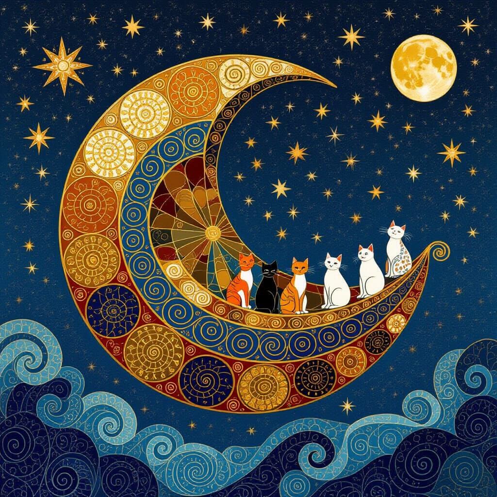 This image shows a Jules Verne-style spaceship adorned with Klimt-inspired gold mosaics and surreal cat motifs. The spacecraft navigates a starry night with blue and pink aurora borealis, rendered in 3D with intricate patterns.