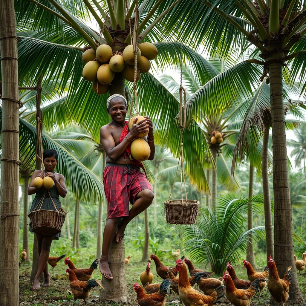 This image shows Southeast Asian farmers harvesting coconuts. The vibrant, earthy colors and textures evoke a rustic aesthetic.