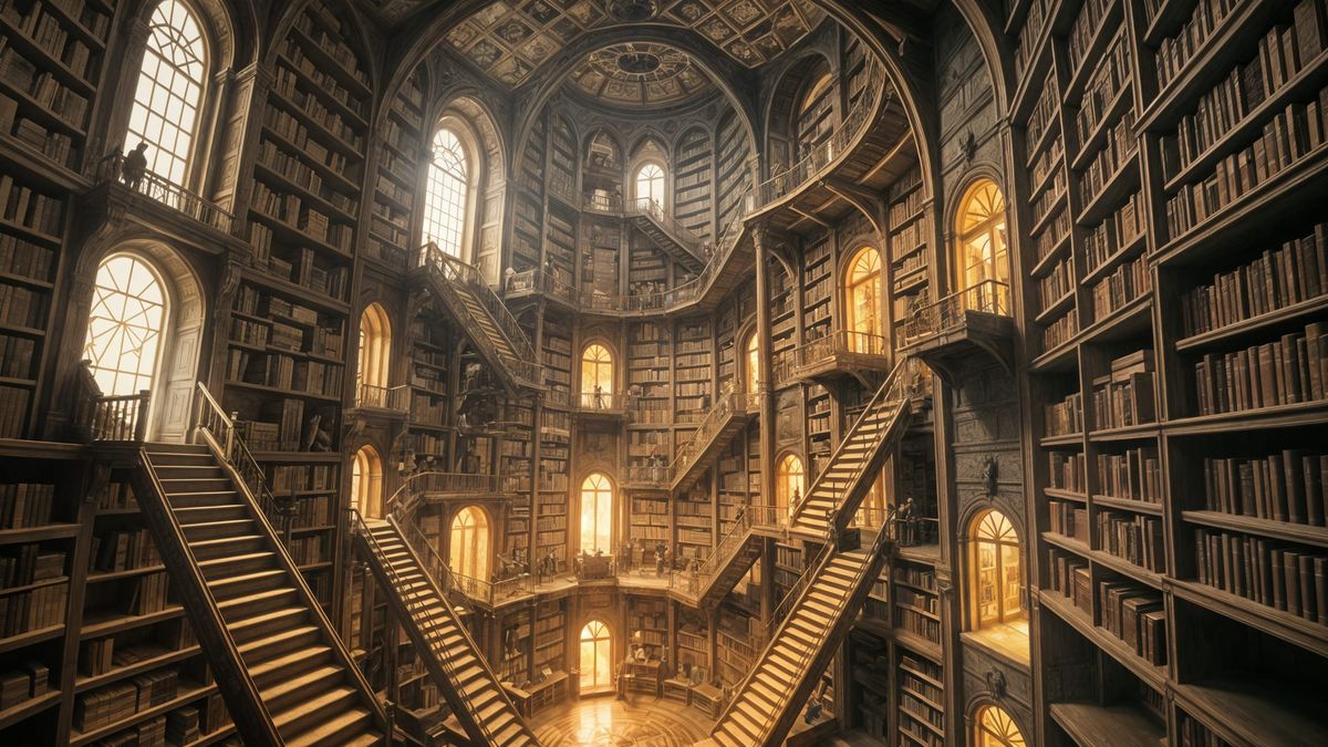 This hyperrealistic concept art depicts an infinite library with impossible architecture and staircases leading into the void. Features levitating books and portals in a warm, mystical atmosphere.