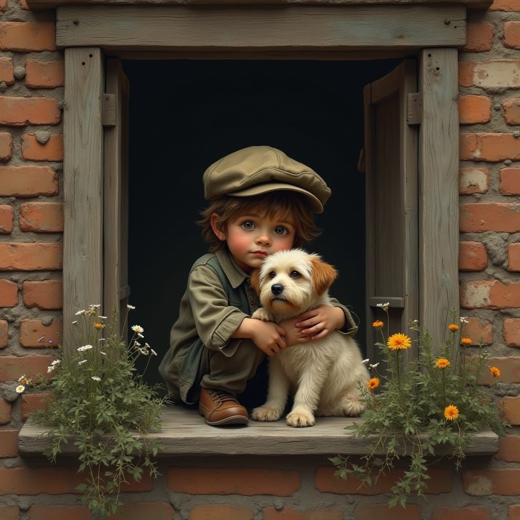 This hyper-realistic image shows a scruffy hobo boy embracing a fluffy dog by an old wooden window. Wildflowers add to the melancholic scene, rendered with rich browns, olives, and soft, misty lighting.