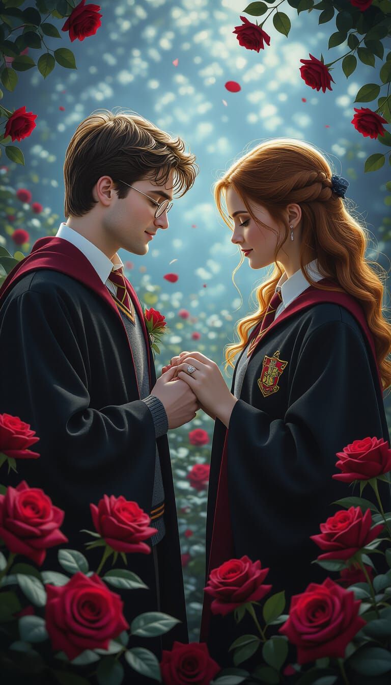 This image shows Harry Potter and Ginny Weasley in a rose garden exchanging a ring. The hyperrealistic 3D scene features cinematic lighting and high contrast in a 35mm film aesthetic.