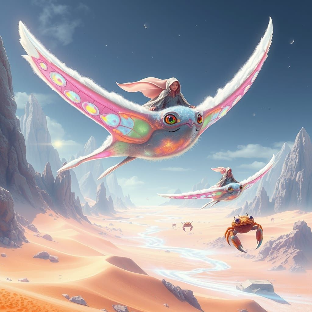 A fantastical image of stingray-like creatures with rainbow features and large eyes flying over a crystal desert. Gelflings wearing robes ride the creatures in this blend of fantasy and futuristic art.