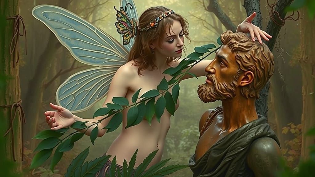 This image shows a blonde fairy woman with leaves covering her chest touching a wooden statue in a forest. Rendered in a 19th-century Pre-Raphaelite painting style with cinematic lighting.
