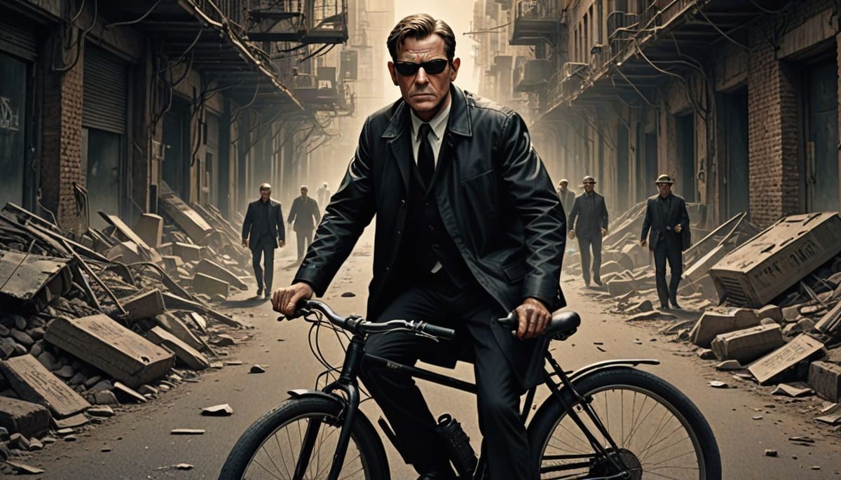 This image shows a man on a bicycle, embarking on a decades-long global journey. He's secretly documenting signs of an impending alien invasion, capturing images of hidden beacons and forgotten ruins.