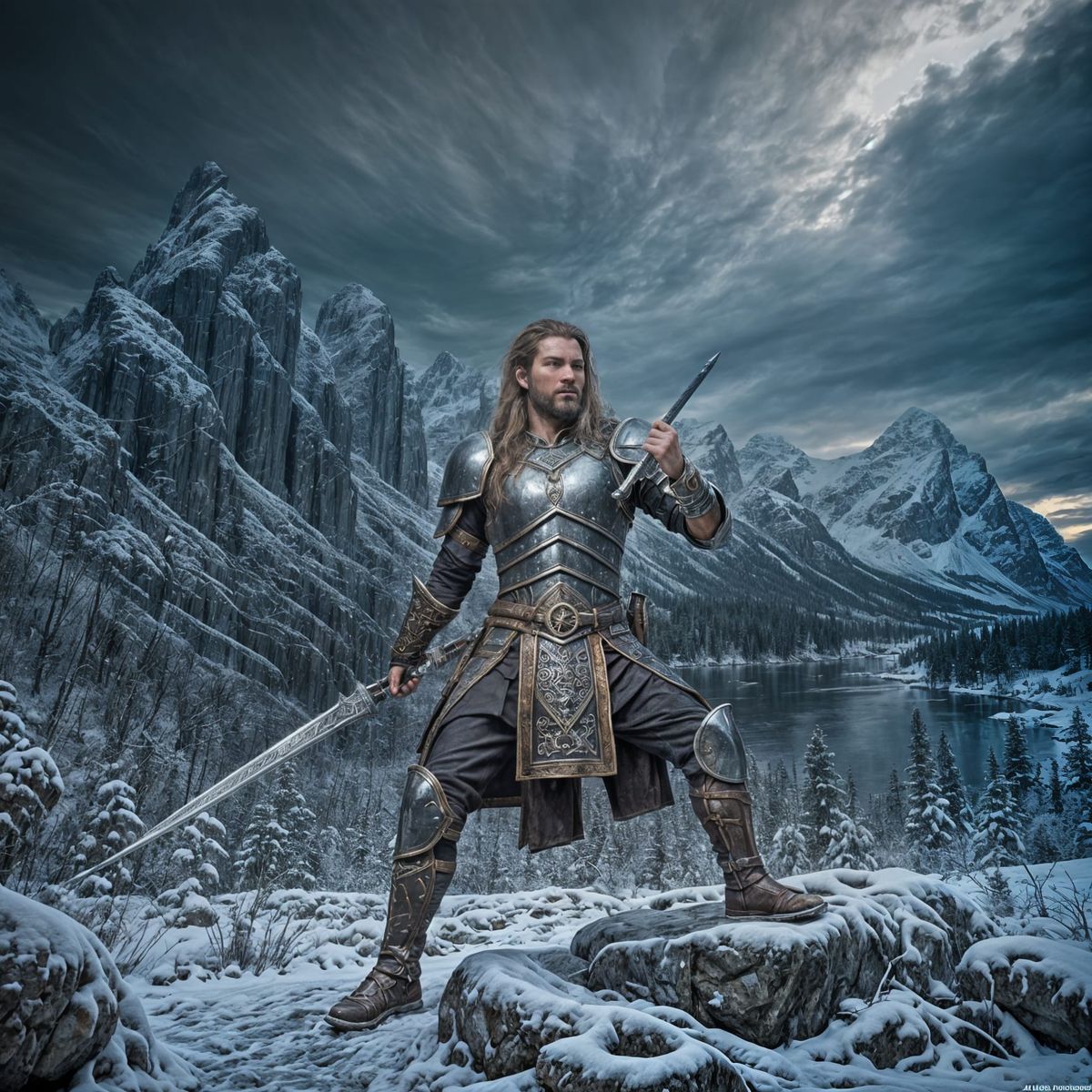 This image features a highly detailed, epic male warrior in dark chainmail armor, posed for battle against a scenic winter backdrop. Rendered in a cinematic, high-contrast digital art style.