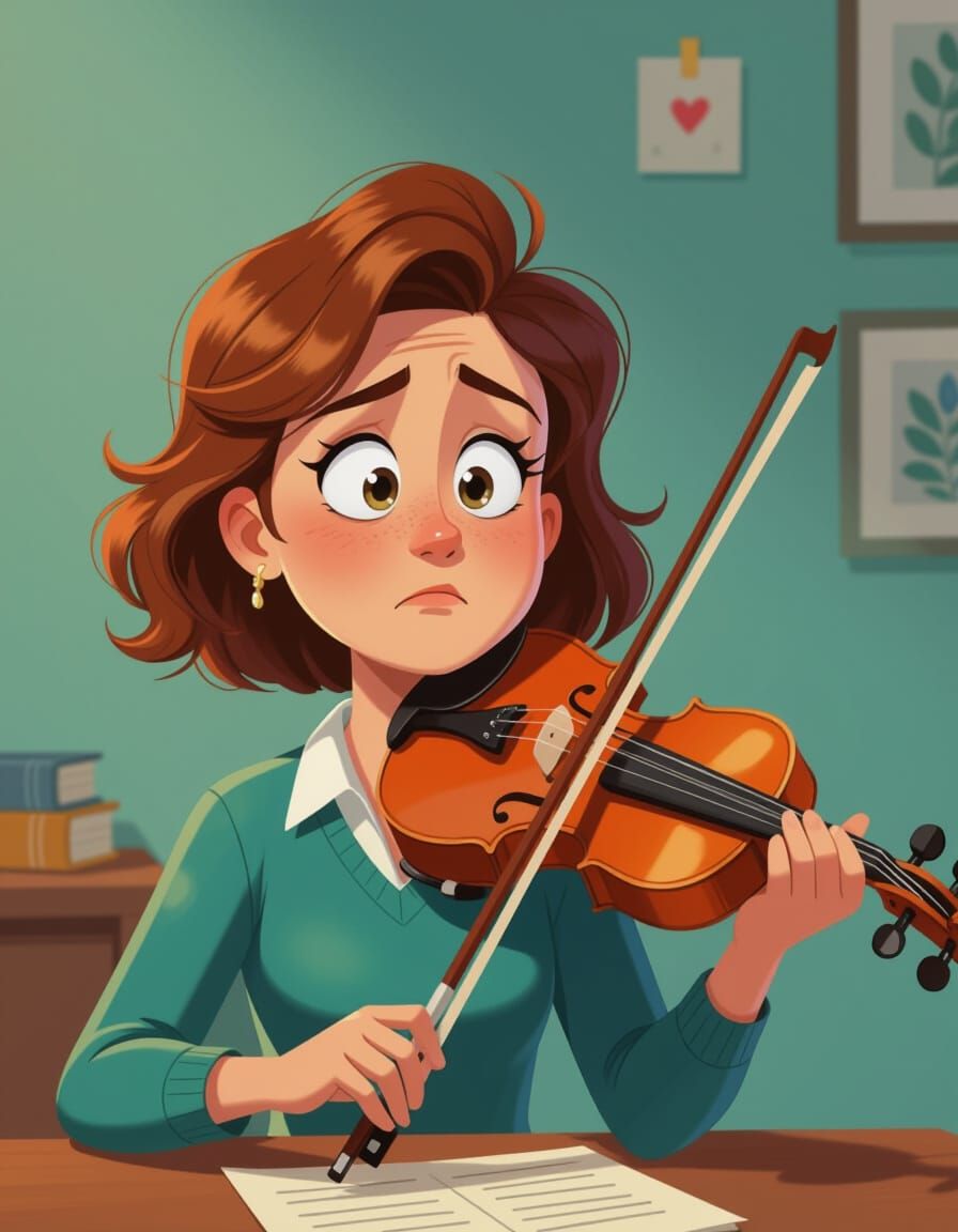 This hyperrealistic image features a sad, frazzled cartoon violinist in a dramatic mid-shot with side lighting against a colorful background. The composition emphasizes facial expression and depth.