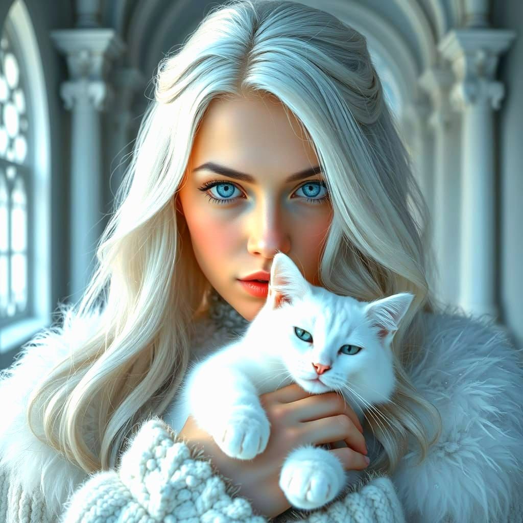 This image features a serene snow maiden with a white cat in her hands, set against the backdrop of a majestic white castle. The intricate details and high contrast create a cinematic and atmospheric scene.