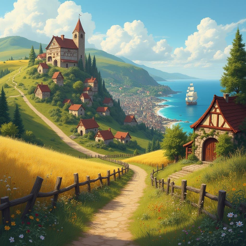 Create your own idyllic village and seaside town scenes with our free AI image generator. It's easy and fun!