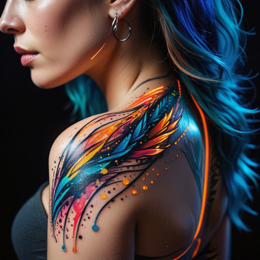 This image shows a close-up of a person getting a flash tattoo. The macro photograph highlights the vibrant ink style, bright colors, and bold lines in a neon aesthetic.