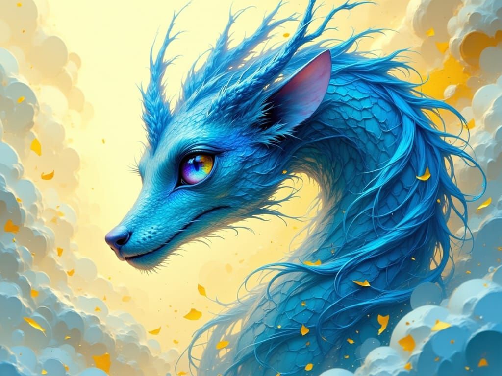 This image shows a strange, blue mythic animal with iridescent fur, set against a swirling dreamscape of white and yellow. The portrait features dynamic, hyperdetailed elements with ornate detailing in a digital painting style.