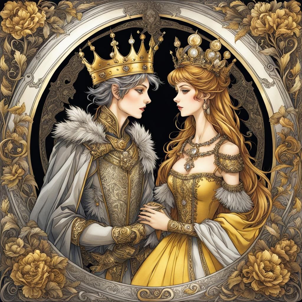 This image shows a fairytale king and queen rendered in an anime style. The artwork is intricately detailed with a gold and silver color palette, reminiscent of Arthur Rackham's illustrations.