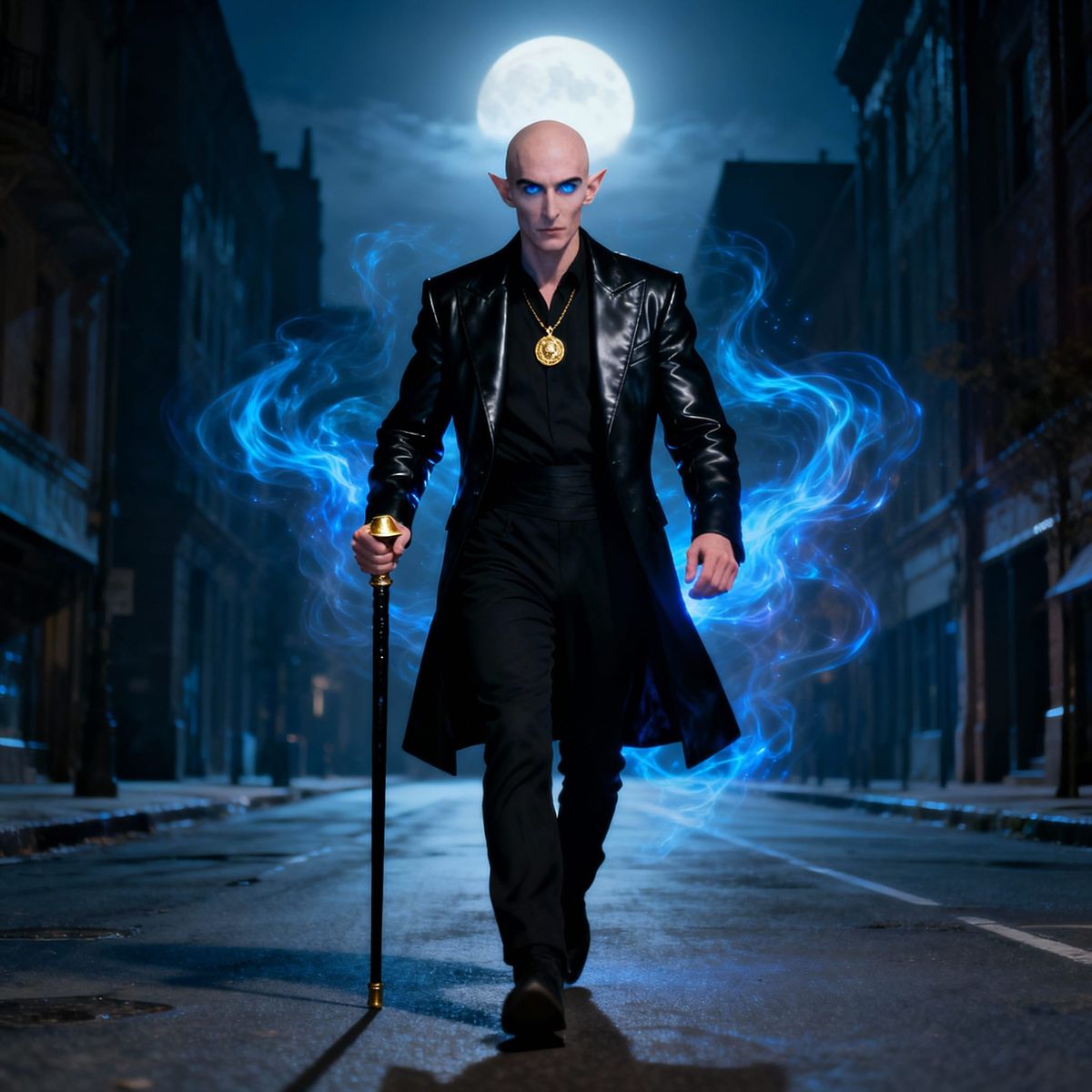 This cinematic image shows a bald man in a leather blazer and golden locket walking down a deserted moonlit street. Blue magical energy swirls around him, creating an otherworldly atmosphere.
