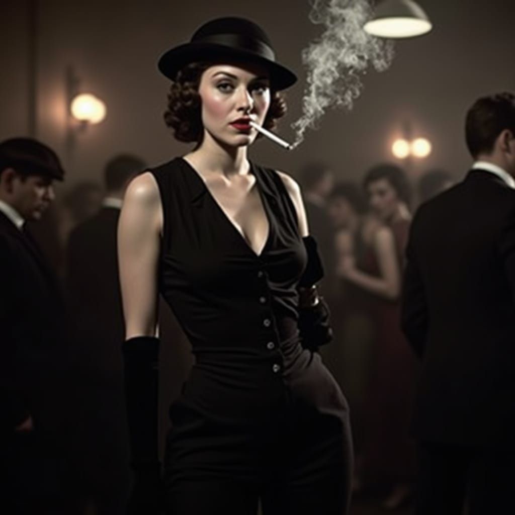 This image depicts a woman in a black pantsuit smoking in a dimly lit nightclub scene. The aesthetic evokes the atmosphere of the 1930s.