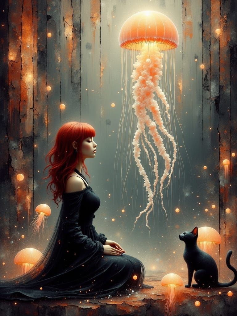 <lora:divineOil:1.0> <lora:Jellyfish Ascension:1.0> <lora:Dreamy Enchantment:1.0> Sorceress, Hdr, misty, Elegance refined, Crackled art effects, she Worships hard on knees, Dressed in witch attire, gothgrunge, Fantasycore, Muted colors, Thick heavy impasto knife palette, Peach, She worships the jellyfish, ...