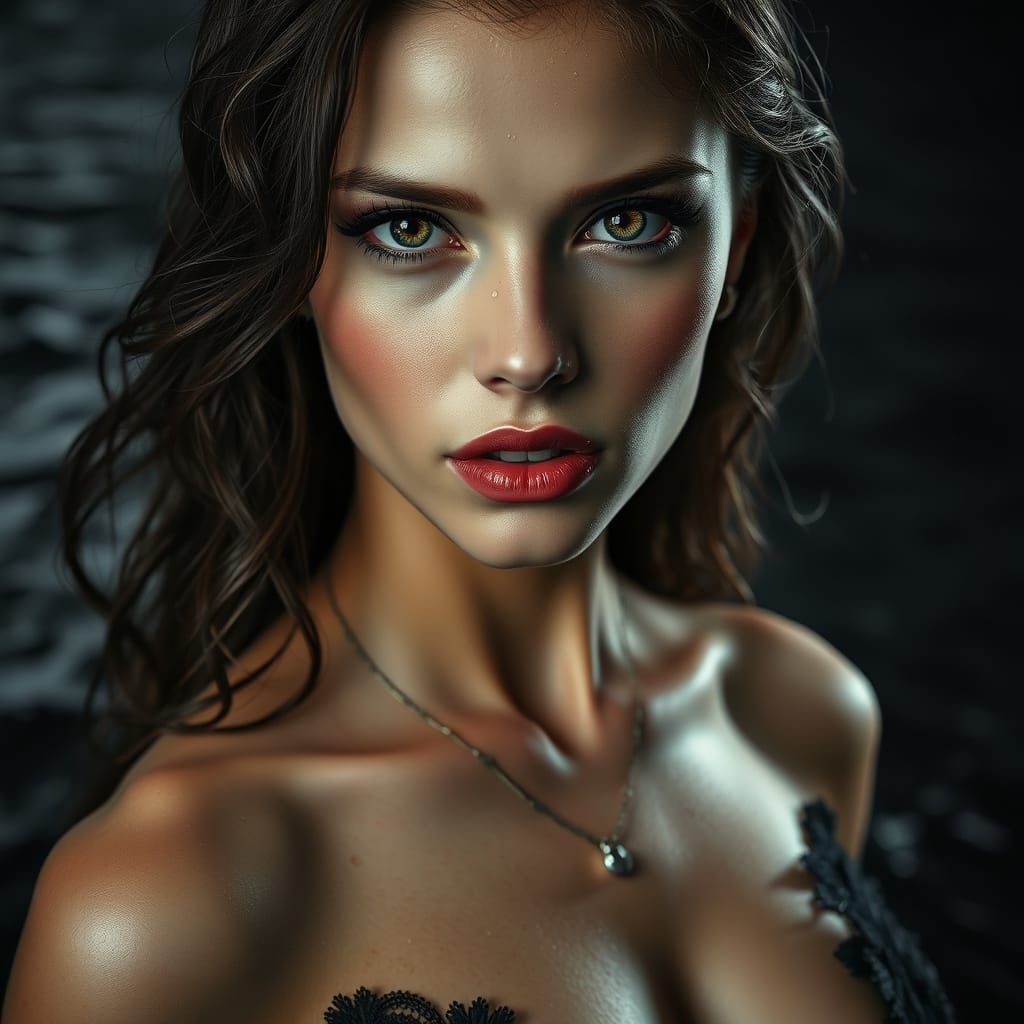 This image shows a hyper-realistic portrait of a woman with an intense gaze and wet, dark hair. The dramatic lighting and cinematic atmosphere create a captivating and detailed composition.
