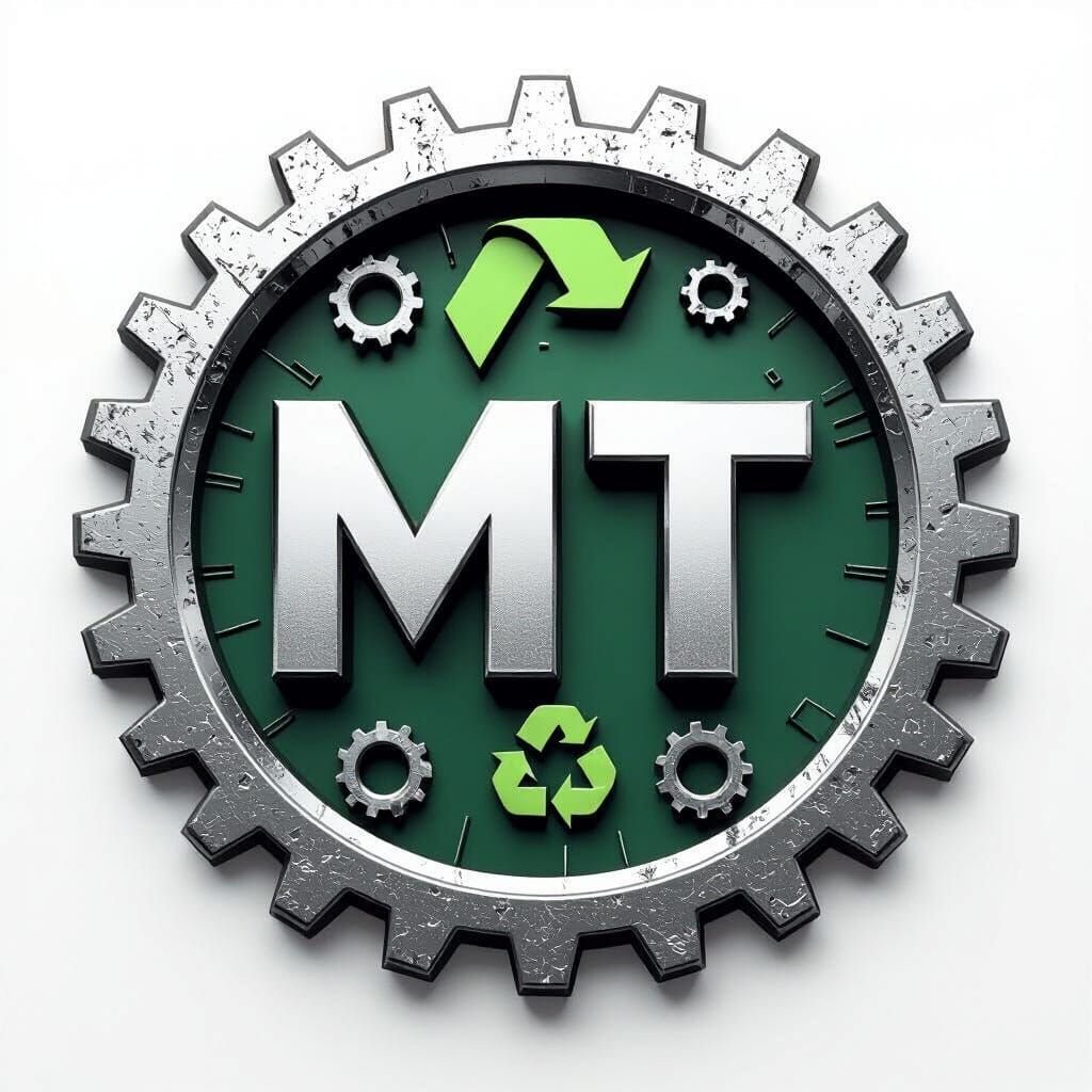 This image showcases a logo design for MT Recycling. Dark green and silver metallic textures combine with gears and industrial elements in a minimalist vector style.
