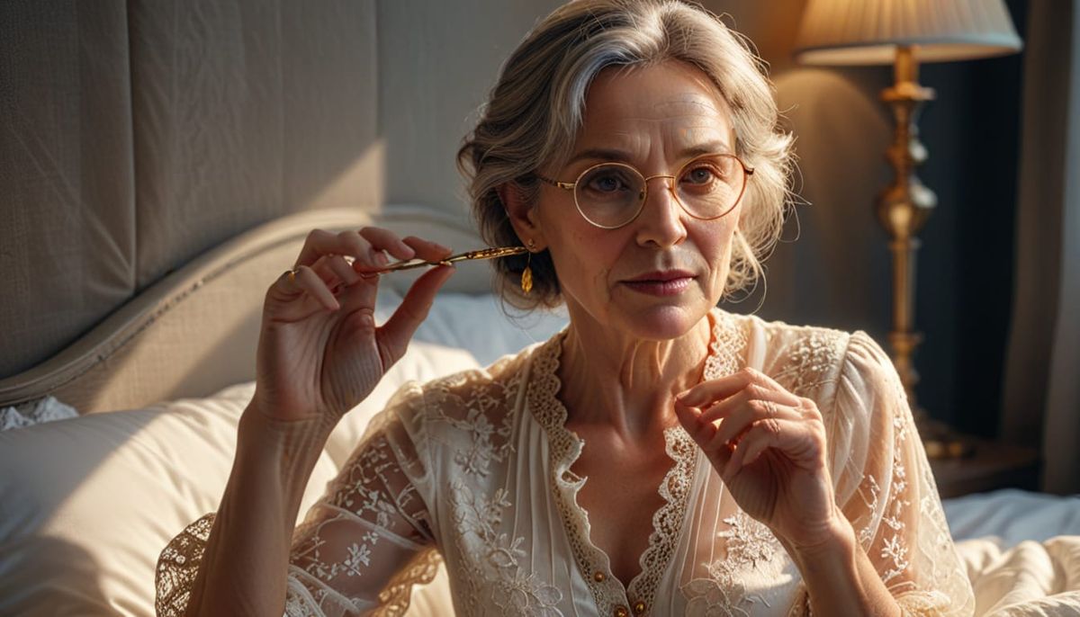 A hyper-realistic digital portrait of a mature woman in bed, handing glasses. Studio lighting illuminates her golden eyes and lace blouse, creating an elegant and cinematic atmosphere.