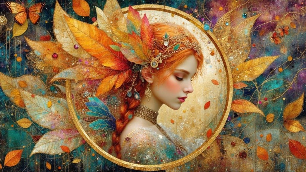A whimsical fae girl with doll-like features, surrounded by a circular motif of gold leaf and idyllic patterns, with a soft, luminous glow and intricate, metallic details in a vibrant, shimmering backdrop.