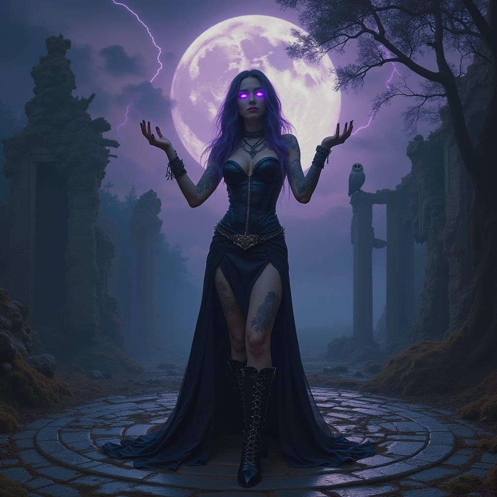 A cinematic image of a beautiful goth witch in a forest clearing, surrounded by ruins. She raises her hands to the full moon, performing magic under dramatic, atmospheric lighting.