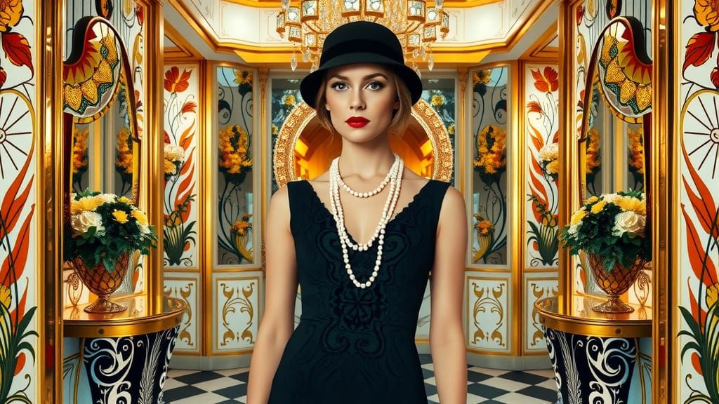 This image shows a woman in 1920s attire within an Art Deco setting. The scene features geometric patterns, metallic accents, and botanical motifs, capturing a glamorous and sophisticated atmosphere.