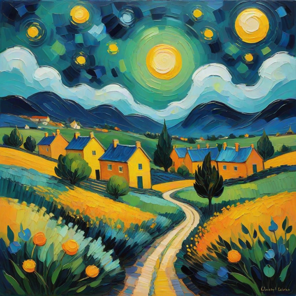 This oil painting depicts a small village under a swirling starry night sky, with thick, heavy brushstrokes and vibrant, textured colours. Warm golden light emanates from the village windows, contrasting with dark blues and greens in the night sky.