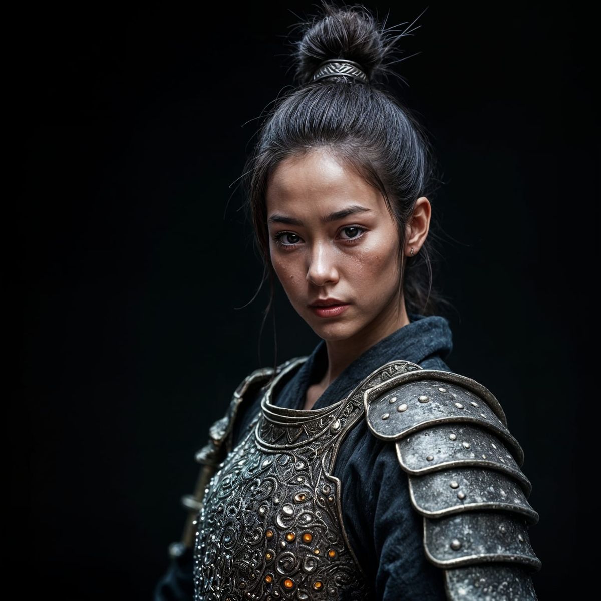 A hyperrealistic airbrush portrait of a female samurai warrior with crystal armor against a black backdrop. The image captures her muscular physique and intense focus with cinematic lighting.