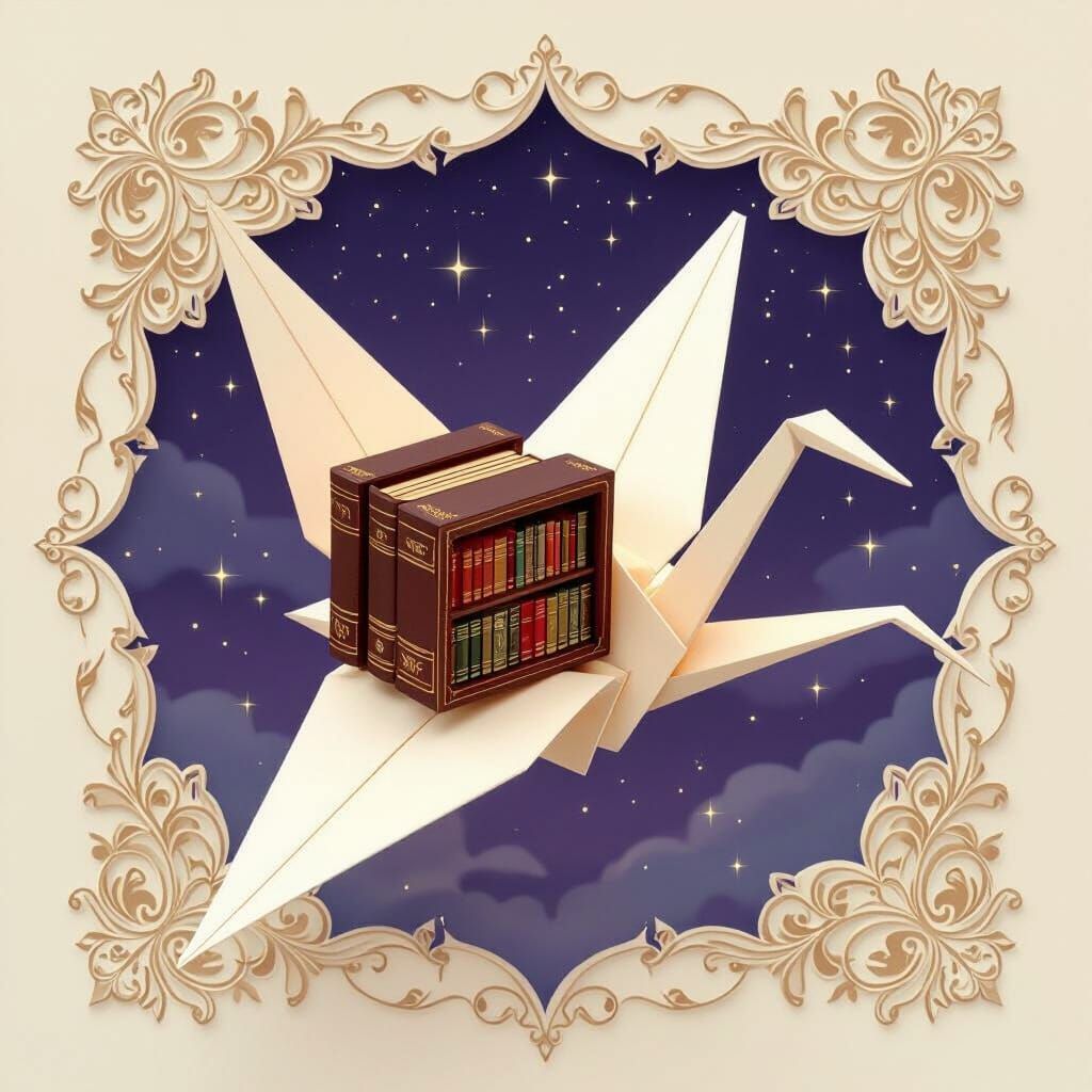 This image shows an origami crane carrying a tiny library through a violet sky. The crane's wings reflect starlight, and the library contains illuminated manuscripts, all rendered with soft focus in a dreamy style.