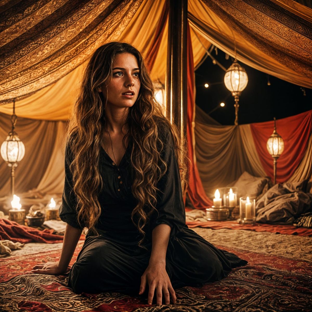 This image shows a woman kneeling in a tent, screaming as waves of power emanate from her. The scene is hyperrealistic with cinematic lighting and a dark, moody atmosphere.