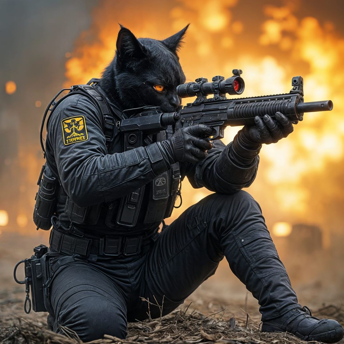 A cyborg cat SWAT officer with yellow eyes kneels amidst a bomb explosion. The feline cyborg, partly mechanical, peers through a sniper scope in this digital artwork.