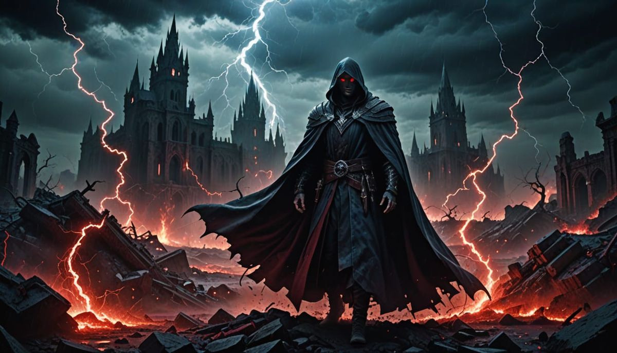 This image shows a hauntingly beautiful scene of a powerful sorcerer standing amidst a supernatural battlefield, surrounded by eerie energy, ghostly apparitions, and glowing magical elements, set against a dramatic, gothic backdrop.