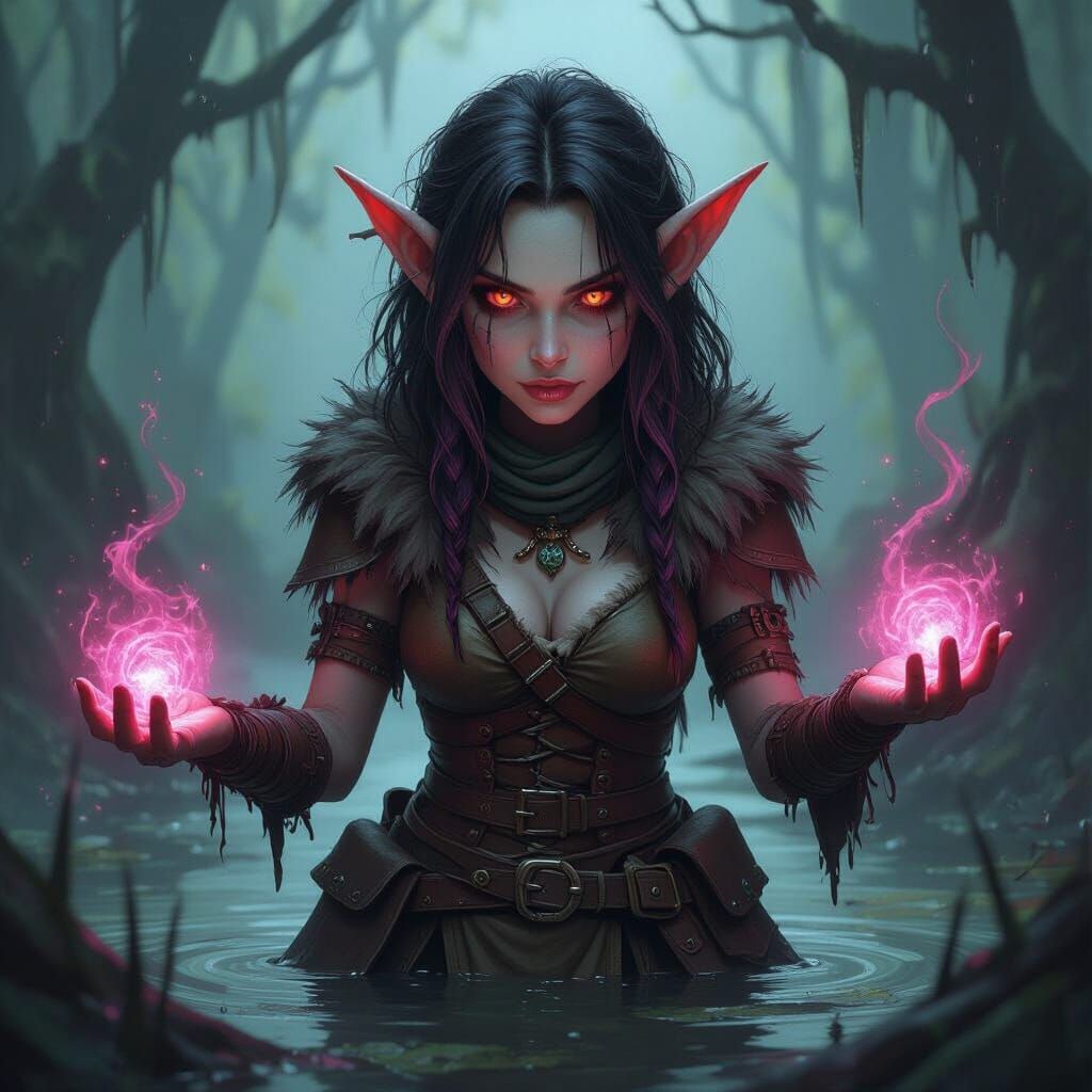 This image shows a wise female goblin hermit standing in a dark swamp. She has pale pink skin, dark hair and eyes, and wears tattered furs and leather armor, in a dark fantasy style.