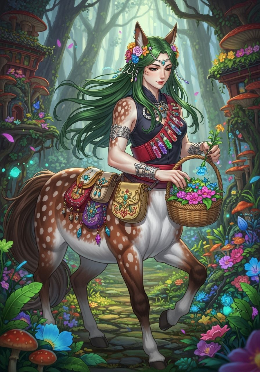 This image features a fantasy centaur maiden, dressed in medieval and Asian-inspired attire, collecting healing plants in an ancient forest. The art style is anime-inspired with maximalist details.