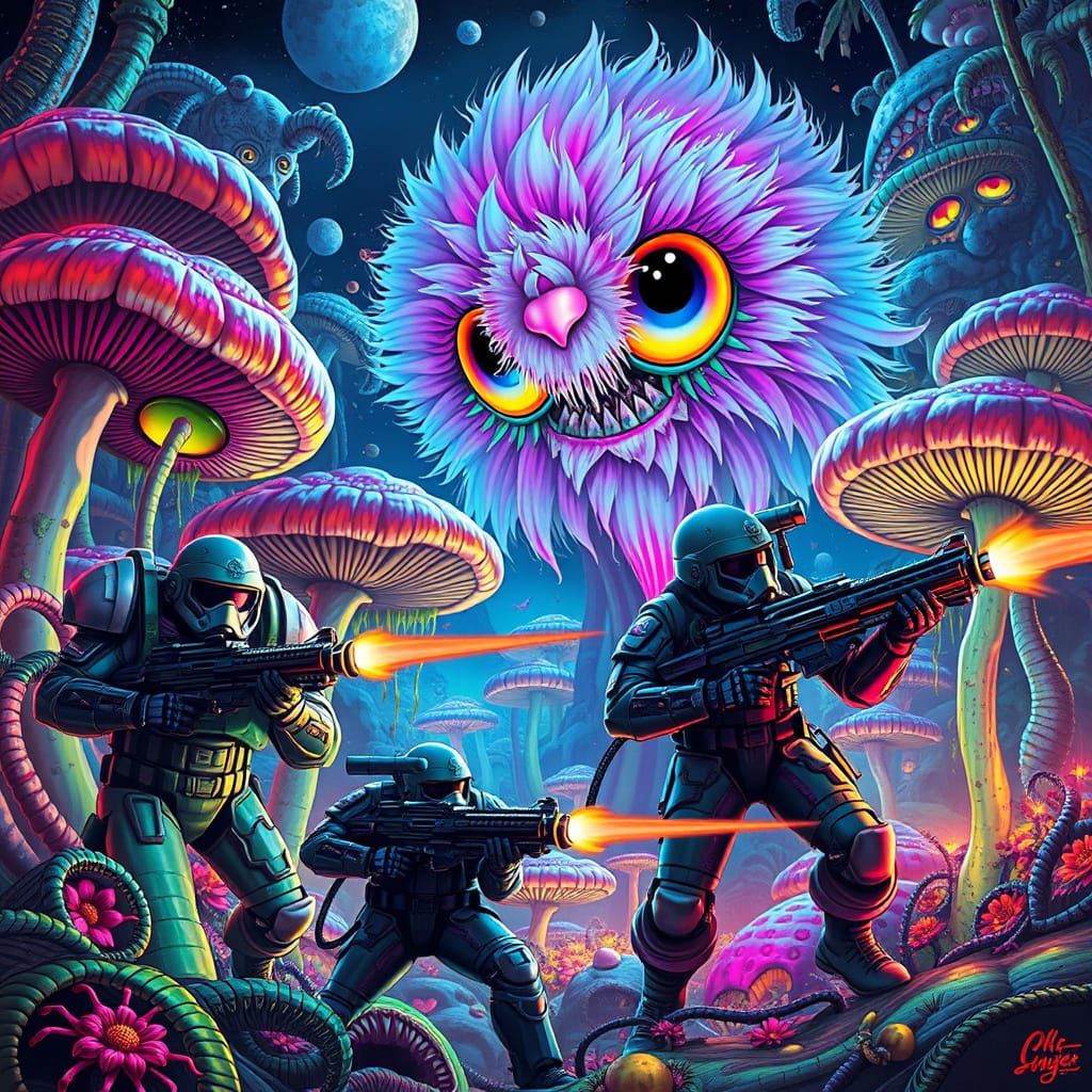This image shows pastel rainbow creatures amidst bioluminescent mushrooms and piranha plants. Space marines are being devoured while firing laser guns, all rendered in a dark, futuristic, psychedelic style.