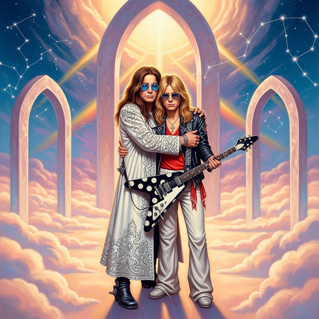 A vivid image of two rock musicians embracing in a surreal, heavenly landscape filled with crystal arches and iridescent clouds. The scene is rendered with bold brushwork and textures, reminiscent of fantasy album art.