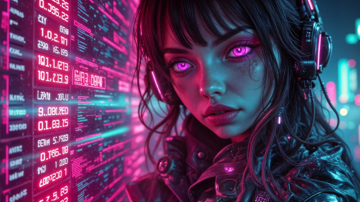 This image depicts a striking cyberpunk woman analyzing financial markets and intercepting data. Rendered in a dark, neon-infused aesthetic.