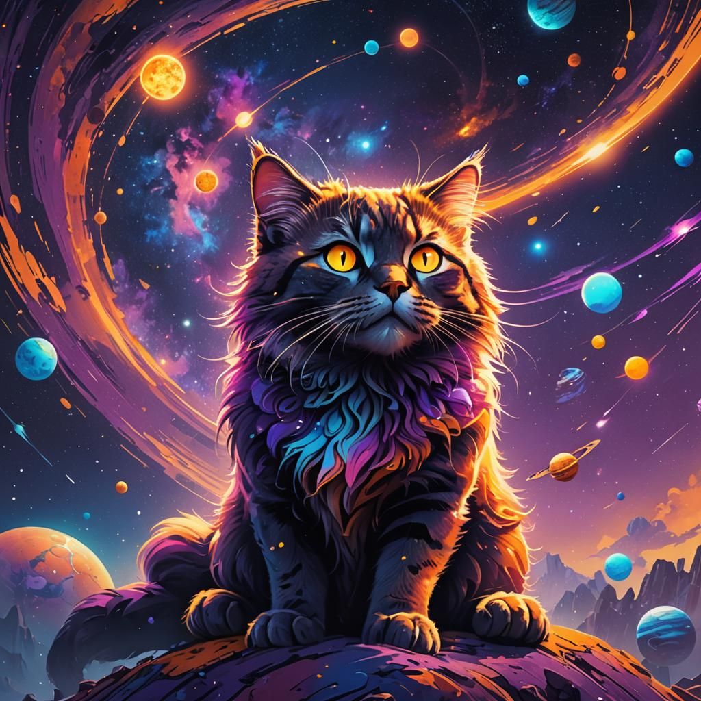 A striking picture of a galaxy cat floating in space among planets and stars. The digital painting is rendered with intricate textures, a vibrant color palette, and soft, gradient lighting.