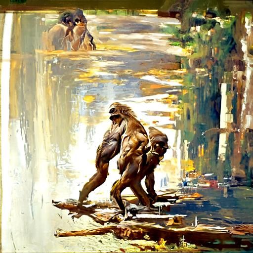 This image shows the concept of evolution, depicted as an oil painting. The artwork captures the essence of James Gurney's style, emphasizing realism and imaginative subject matter.