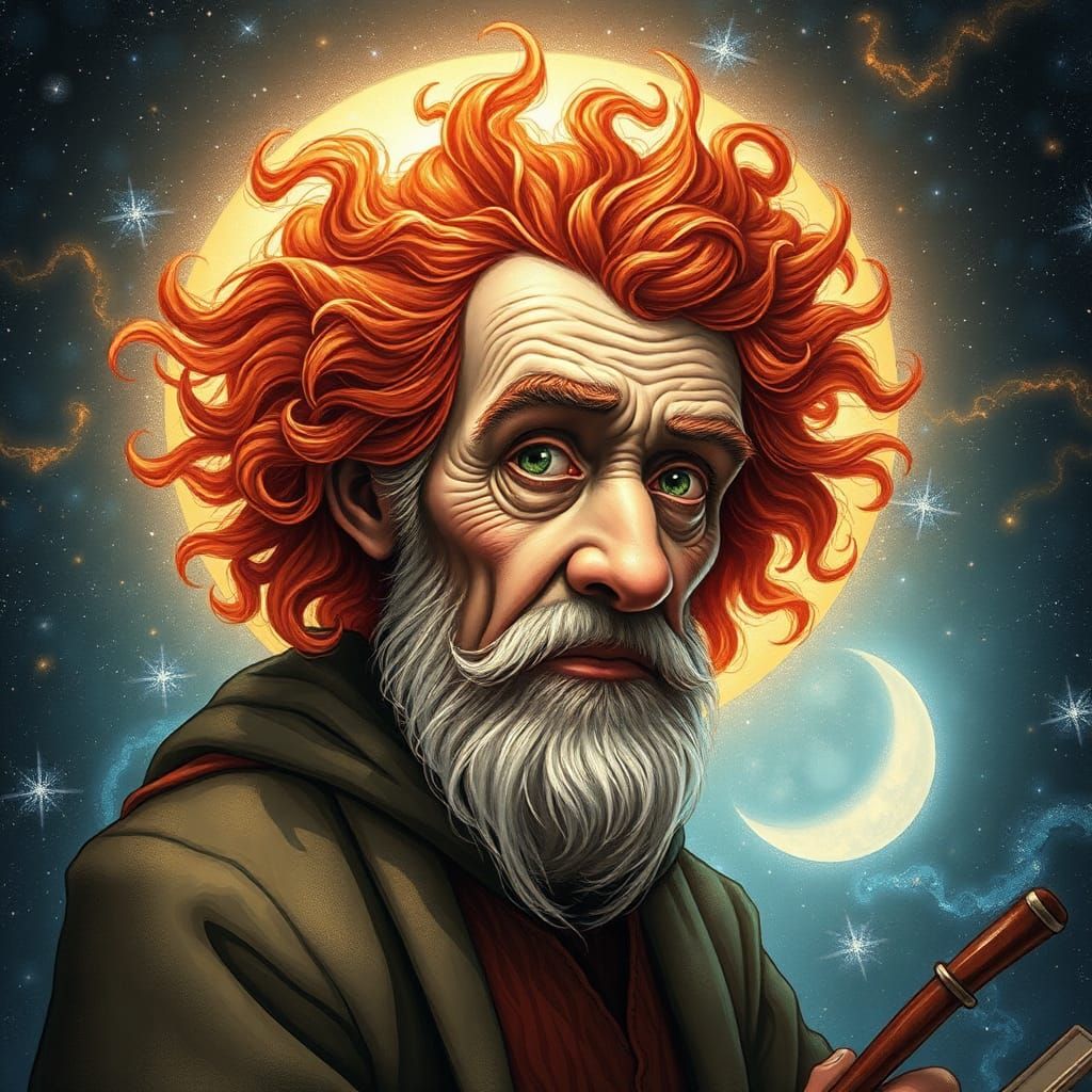 This image portrays a red-haired elderly teacher bathed in ethereal light. The artwork blends whimsical pen and ink drawings with vibrant visionary art, rendered as a shimmering holographic image with astral glows and mixed media textures.