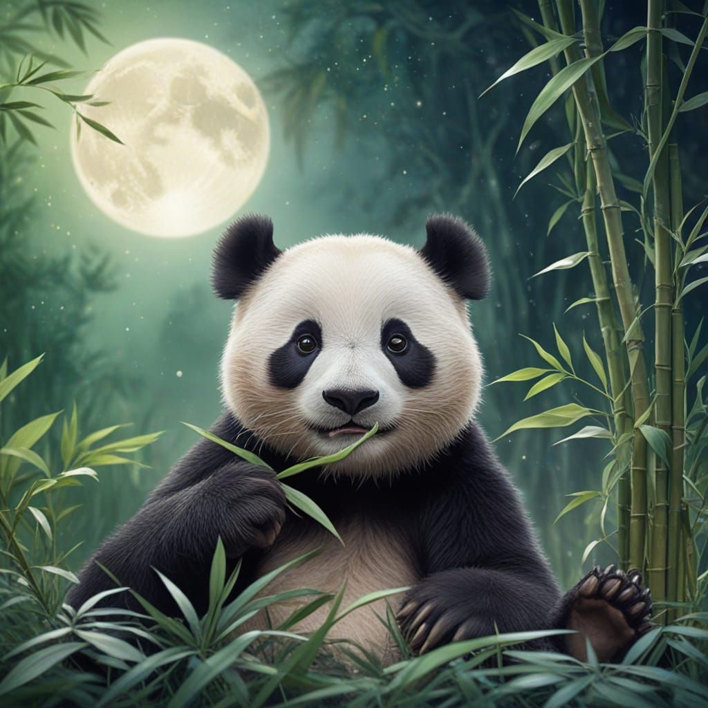 A charming picture of a panda enjoying bamboo on a leafy bed. Rendered in dreamy watercolor style, the scene features starlight, moonbeams, and soft, ethereal lighting with pastel gradients.