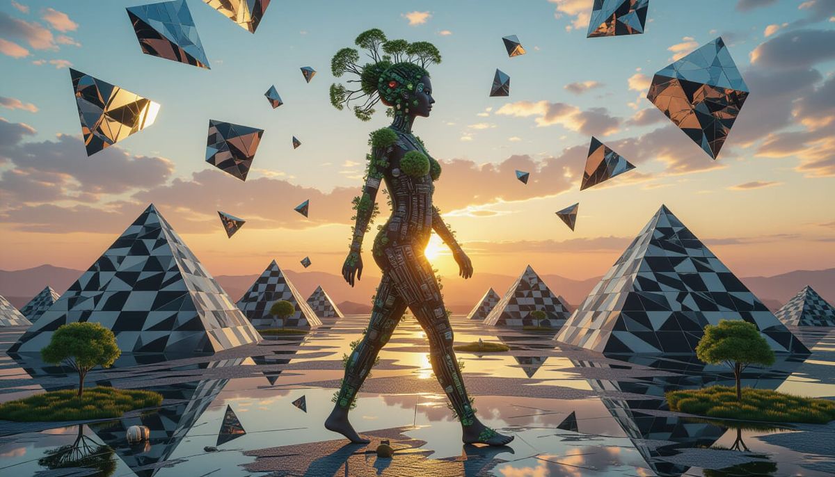 A surreal image of a woman formed from tools and plants walking on a monochrome pyramid landscape. Her body is an ecosystem, the sky fractured mirrors. The artwork features intricate patterns and dreamlike qualities, in the style of a vibrant digital collage.