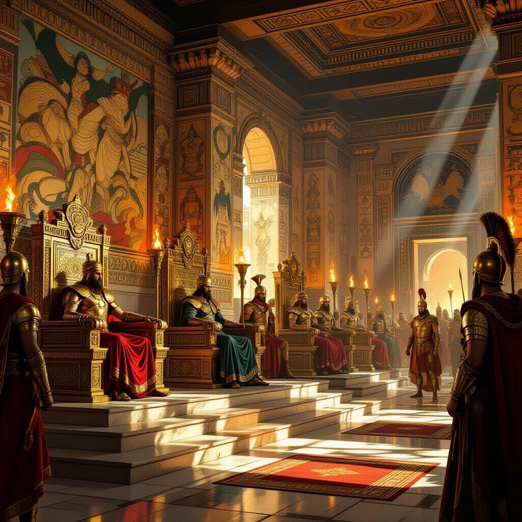 Experience a 1000 BC Bronze Age palace with ornate thrones and regal figures in ceremonial attire. Soldiers in armor stand guard in a throne room adorned with mythical carvings, all depicted in an epic mural style with dramatic, warm lighting.
