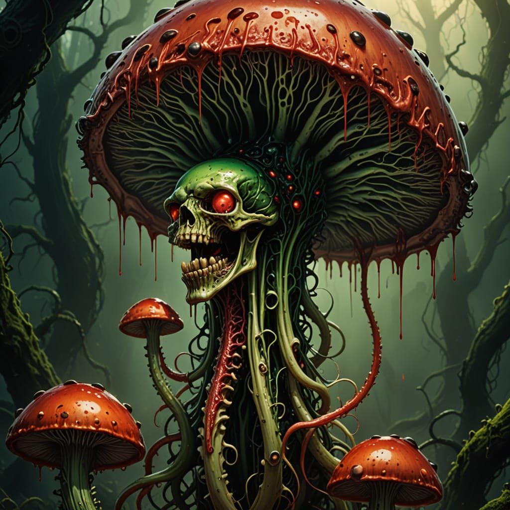 This image depicts a close-up of a grotesque, pulsing mushroom growth infecting a bloody, gore-ridden open wound, with iridescent fungal tendrils and flesh-like mushroom caps that ooze a viscous, greenish liquid, rendered in a dark, biomechanical style with muted colors and high contrast.