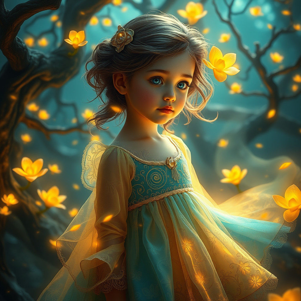 A striking picture of a young girl in a mystical forest. The girl is wearing a flowing dress and is surrounded by glowing flowers. The image has a vibrant and dreamlike fantasy art aesthetic.
