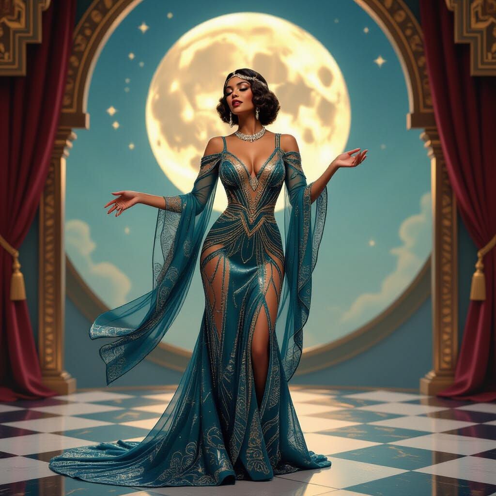 A captivating image of a turtle dressed as a jazz singer. The turtle is singing on a Harlem Renaissance stage, with geometric art deco elements and a noctilucent color gradient.