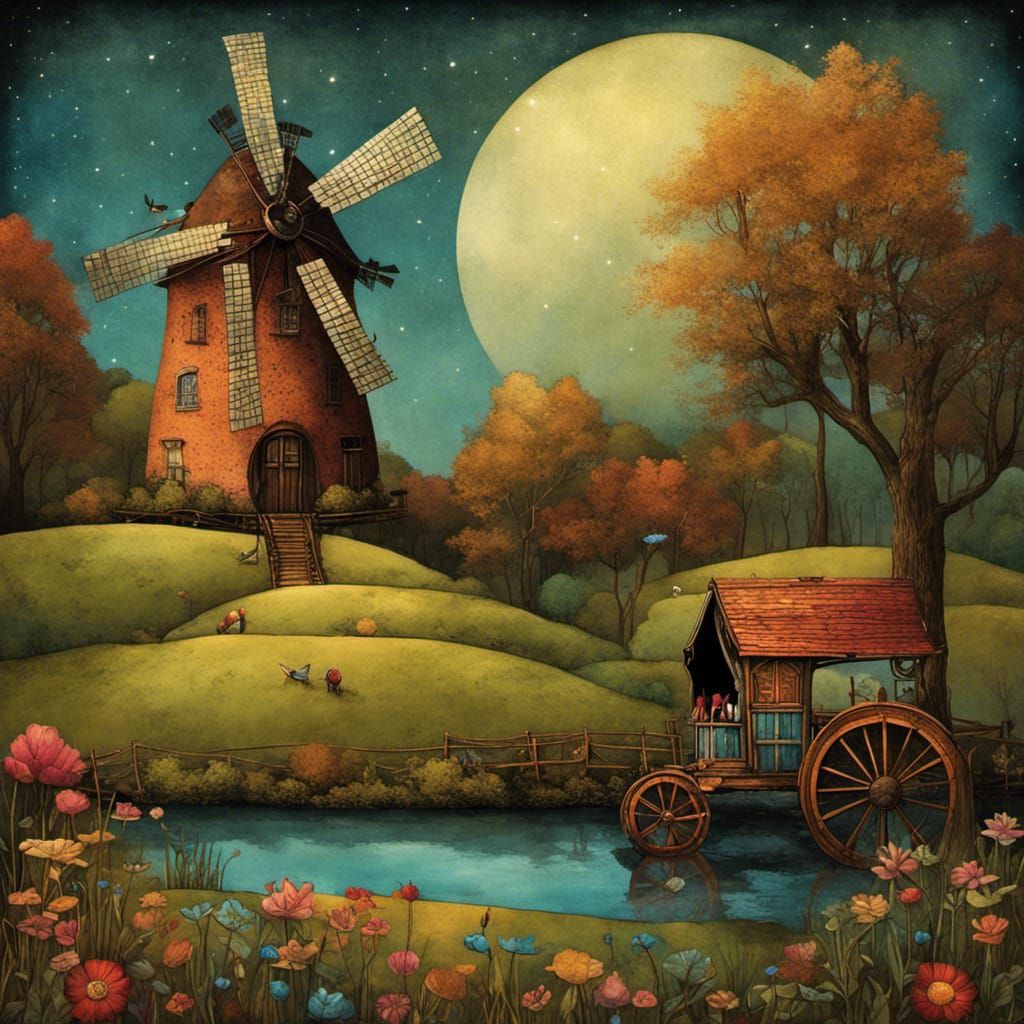 Storybook illustration of an impressive old windmill and a colorful gypsy wagon in a Fairytale landscape by andy kehoe sally swannell