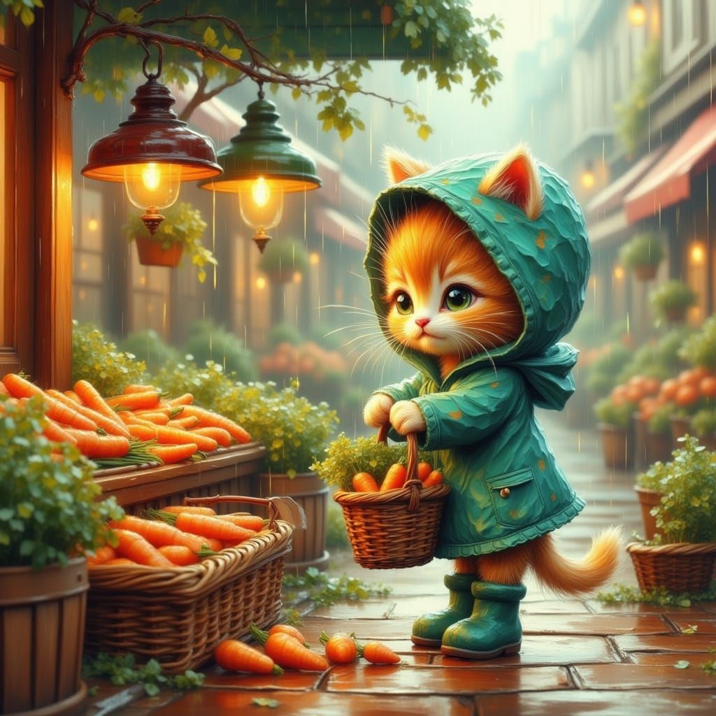 This image shows a fluffy kitten in a raincoat buying carrots at a vegetable stand on a rainy day. Rendered as bright and colorful 3D digital art with a radial gradient background.